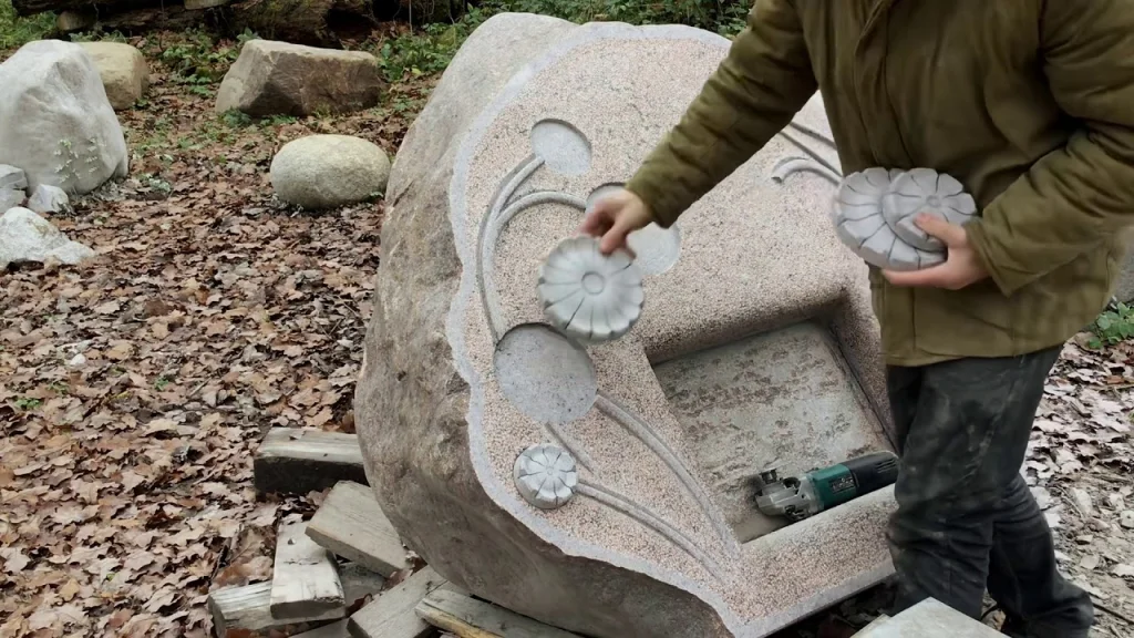 Unikāla tēlniecības autortehnika - virpotu akmens ziedu inkrustācija plaknē. Ronalds Jaunzems